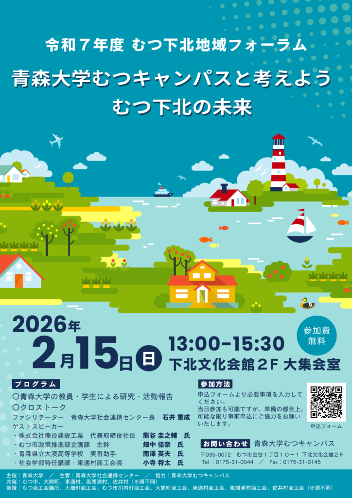 2月15日(日)に、令和7年度むつ下北地域フォーラムを開催します。 青森大学は「地域とともに生きる大学」として、地域の皆様と連携し、 さまざまな地域貢献活動に取り組んでいます。 青森大学の教員や学生の地域連携に関連する研 […]