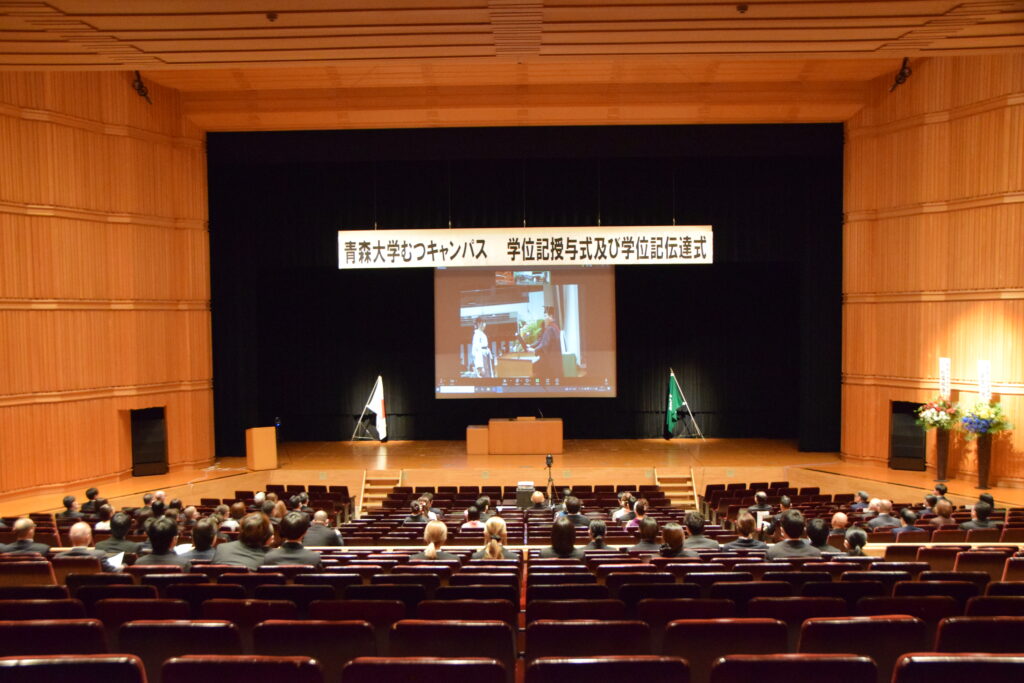 学位記授与式は青森本校、むつキャンパス、東京キャンパスの3つのキャンパスをオンラインでつないで行われ、