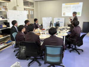 下山学園高校商業科の2年生がソフトウェア情報学部の研究室を訪問、大学生が取り組んでいるさまざまな研究プロジェクトを見学しました(3月31日(火))。
