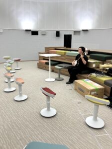 ソフトウェア情報学部角田研究室3年生の倉知哲平さん(3年生)がむつキャンパスのフィッシュボールルームでプロジェクションマッピングのためのロケハンを行いました。