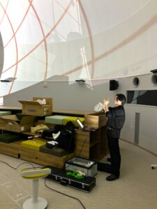 今回、倉知さんは伝統芸能とメディアアートの融合をテーマに、三味線の演奏と連動するプロジェクションマッピングの研究に取り組んでいます。ロケーションとして選んだむつキャンパスのフィッシュボールルームは、プラネタリウムの跡地として半球のドーム天井を有する人気のイベントスペースで、プロジェクションマッピングの対象としても非常に難易度の高いものとなっています。