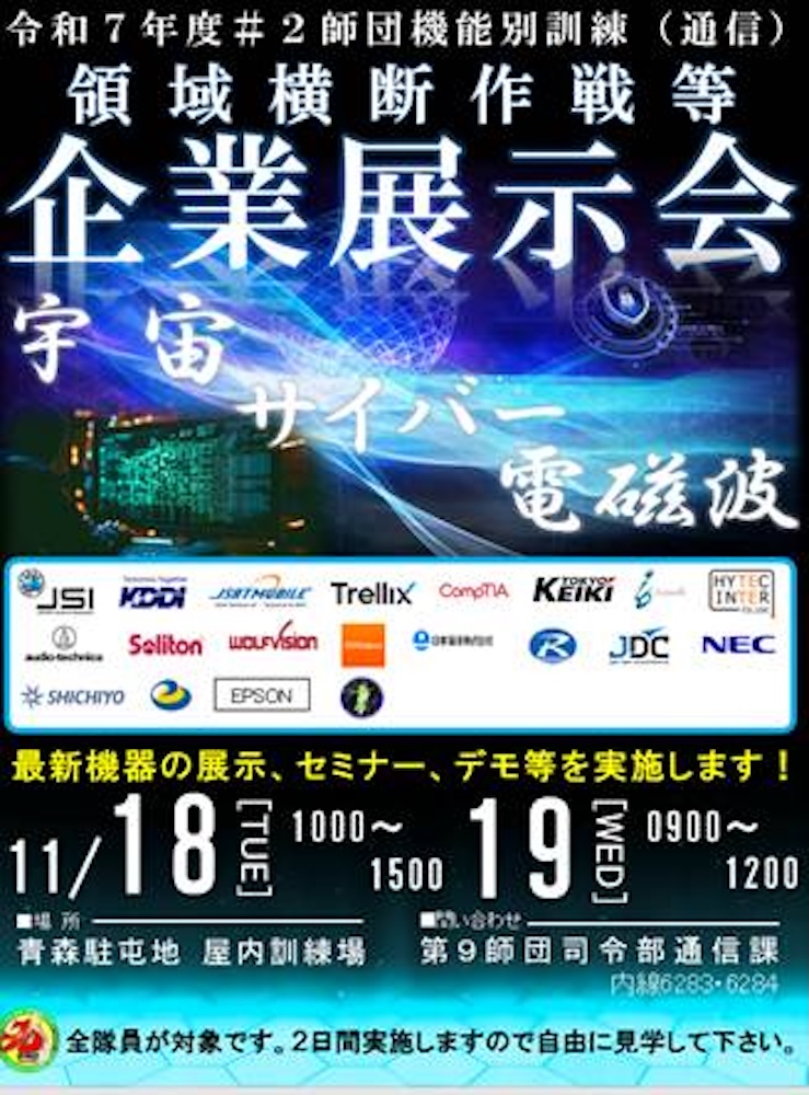 11月18日、19日の両日、自衛隊第2師団による機能別訓練の一環として「宇宙・サイバー・電磁波」をテーマに企業展示会が青森駐屯地で開催され、防衛に関わる最先端技術の展示が行われました。
