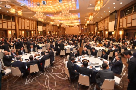 式典終了後には会場を青森市内のホテル青森に移し、記念祝賀会が開催されました。会場には700人を超える来賓、参加者にお集まりいただきました。青森山田高校吹奏楽部の伴奏で学園歌を斉唱、岡島成行理事長による挨拶に続き、木村次郎 衆議院議員、青森商工会議所 若井敬一郎会頭から祝辞をいただきました。特別表彰・特別顕彰表彰が行われ、サッカー柴崎岳選手や卓球の福原愛選手、水谷隼選手などからの祝電が披露された後、林光男・本学園創立100周年記念実行委員会名誉会長が乾杯、華やかに祝宴が始まりました。会場では青森山田学園関連校のオリジナルビデオが上映され、隆桜会の指導による高校生主体のねぶた囃子で大いに盛り上がりました。