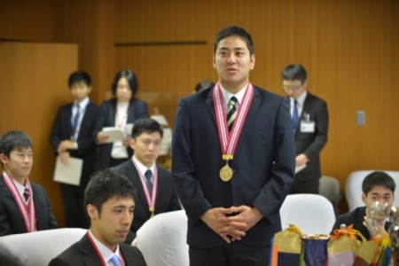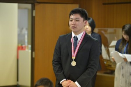 中田監督が「今大会はケガもあり本当に苦しかった。神の力にも縋る思いだった」と感想を述べると、小野寺晃彦市長は「中田監督でも神頼みしなければならないほど今大会は大変だったんだと思う。それでも結果を残せたのは中田監督の選手を信じる心、選手たちの監督や仲間を信じる心、そして日々の練習の賜物。辛い時も家族、友人、先生方、そして仲間たちがいつも見守っていてくれたから。新体操部の活動で培った経験を、次のステップで活かしてほしい」とねぎらいの言葉を送りました。