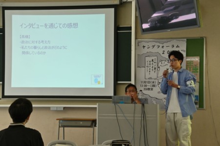また、むつキャンパスの学生たちは、むつ市選挙管理委員会に対するヒアリング結果について、若者の投票率が低いこと、対策として期日前投票や出前講座、投票箱の小中学校への貸し出しなどが行われていることを報告しました。
