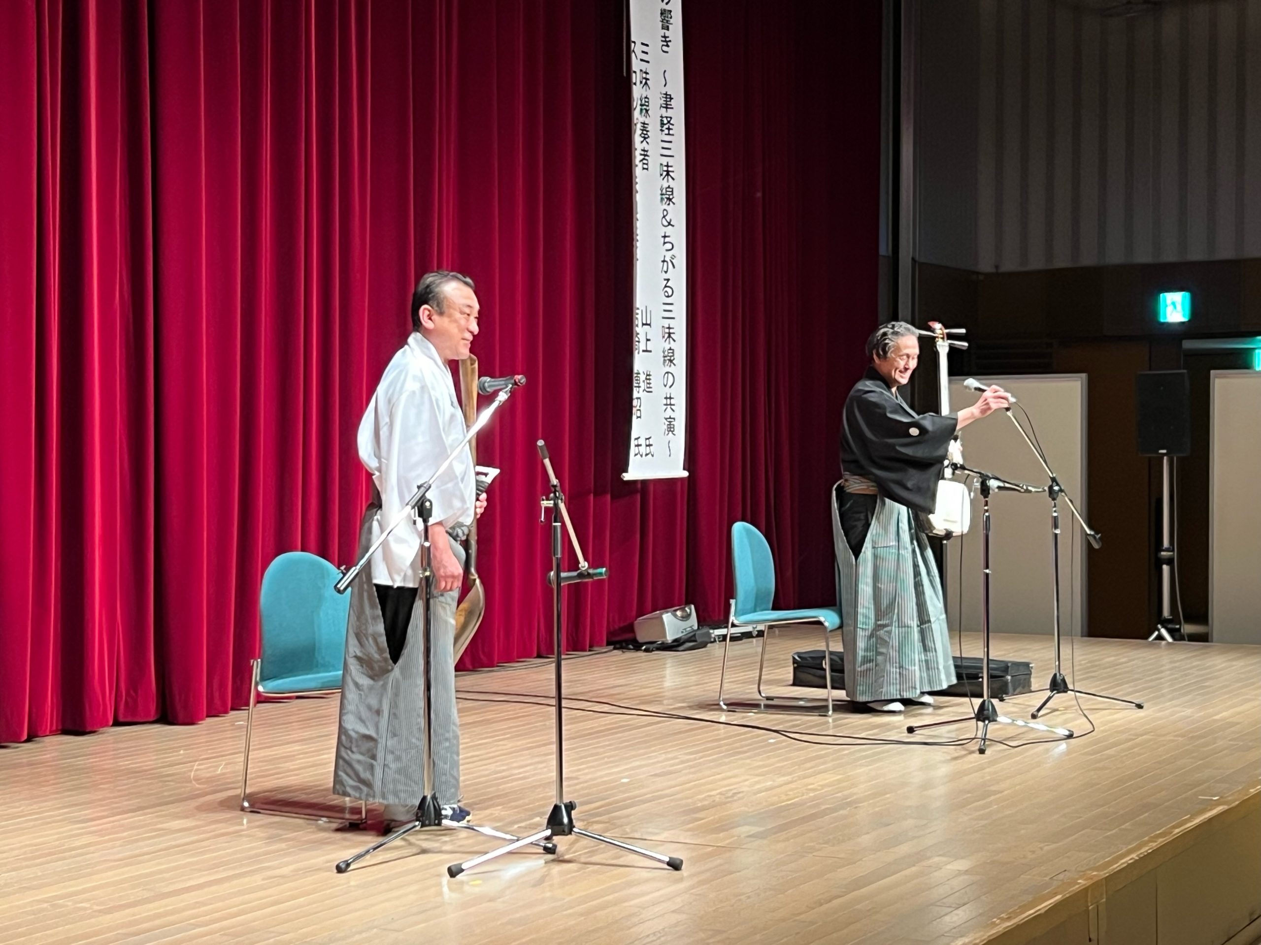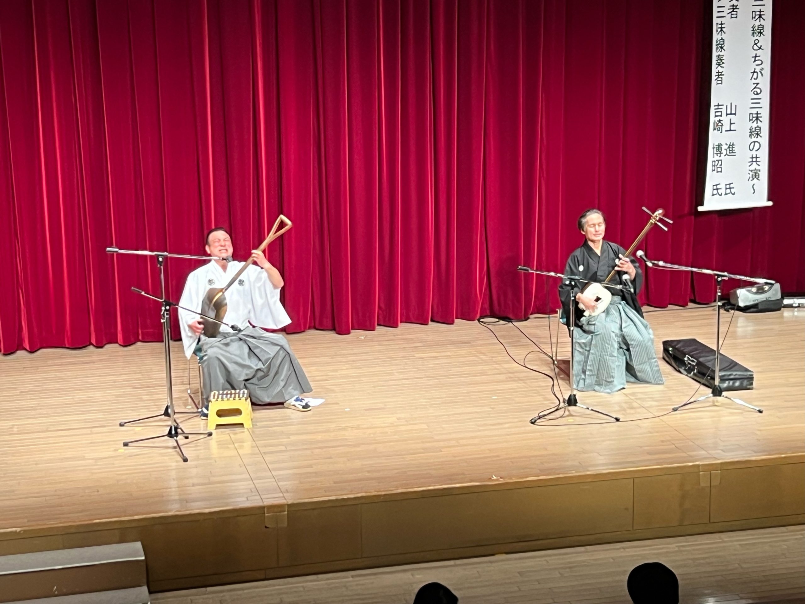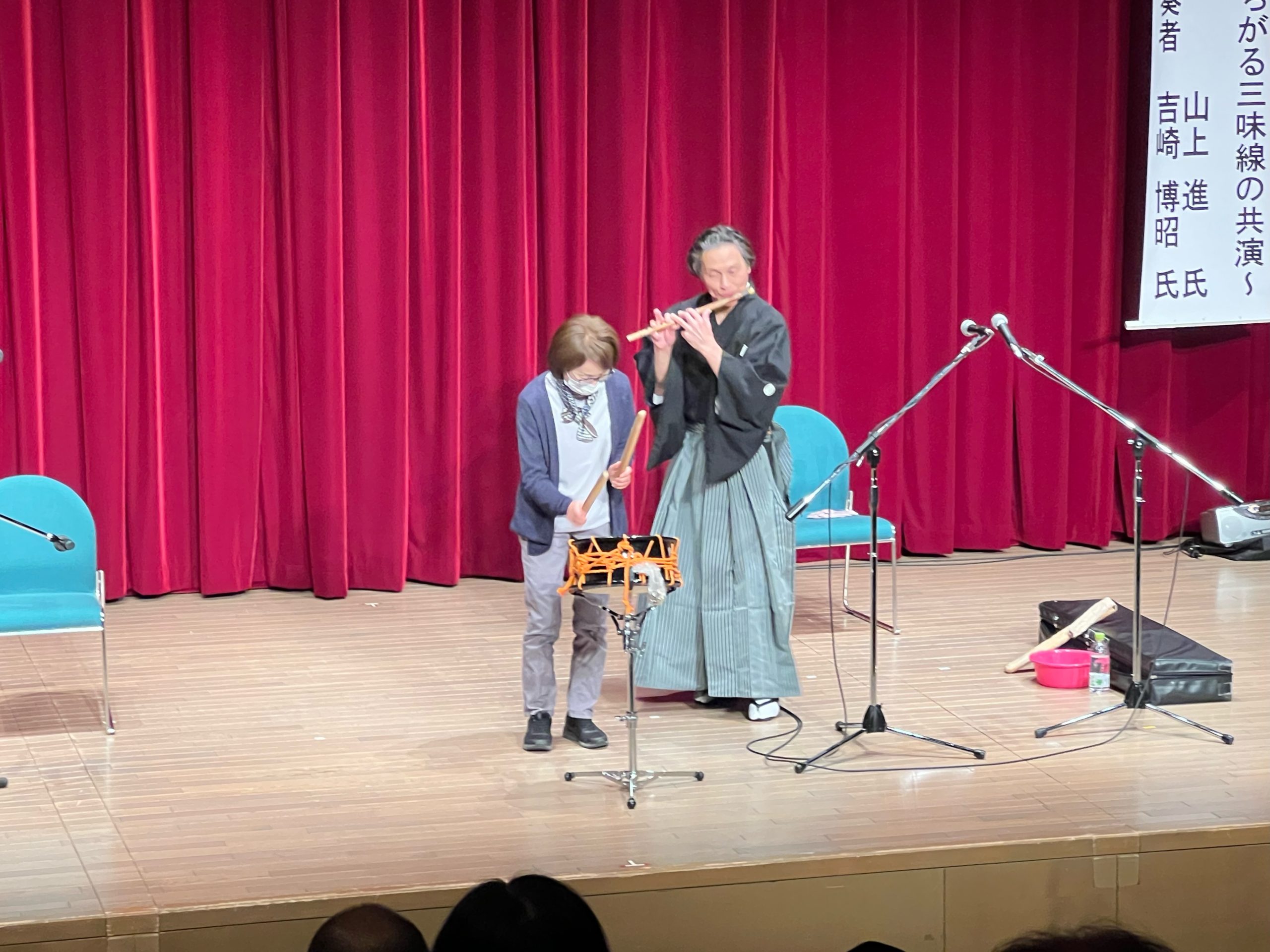 開講式に続いて、第1回目の講座は、津軽三味線奏者の山上 進 氏とスコップ三味線奏者の吉崎博昭氏を講師としてお招きし、オープニングコンサートを行いました。
