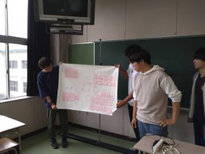 この日の経営基礎演習Ⅰ(1年 飛鳥ゼミ)では、発想を広げる手法の一つである「KJ法」を実践しました。4月に入学して以来、基本的な文章の書き方や読み方、文章を論理的に組み立てるロジカルシンキングなど、さまざまなアカデミックスキルにふれてきた演習のなかで、一番楽しそうに取り組んでいました。