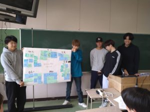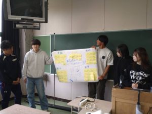 この日の経営基礎演習Ⅰ(1年 飛鳥ゼミ)では、発想を広げる手法の一つである「KJ法」を実践しました。4月に入学して以来、基本的な文章の書き方や読み方、文章を論理的に組み立てるロジカルシンキングなど、さまざまなアカデミックスキルにふれてきた演習のなかで、一番楽しそうに取り組んでいました。