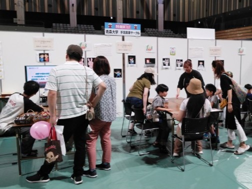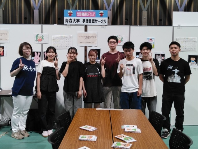 9/13(土)、14(日)の2日間、カクヒロスーパーアリーナにて開催された「青森みんなの防災フェア2025」にて、防災時に使える手話を広めるべく、手話言語サークルが出展しました。