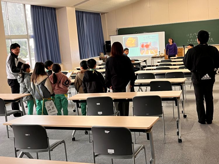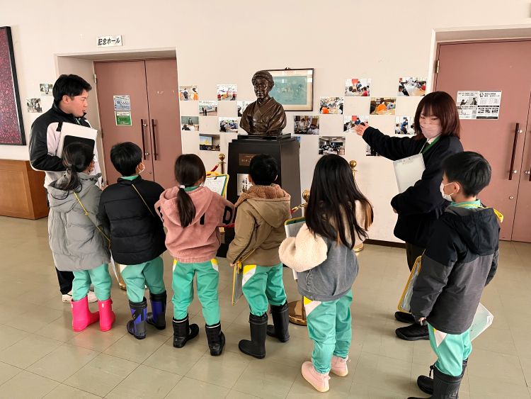 本学園創始者の山田きみ氏の銅像も見学してもらい、「大学はいつできたの?」という質問も出ました。学生の人数や教員の人数など、小学校との規模の違いに驚いていました。
