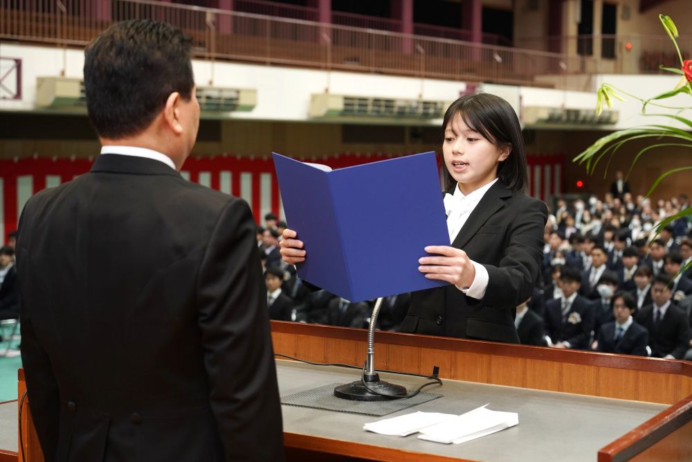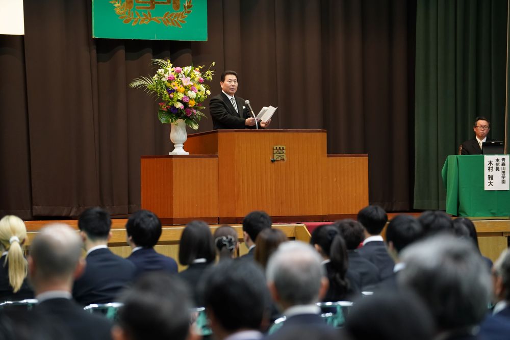 式では、澁谷泰秀青森大学学長が式辞を述べ、木村雅大青森山田学園本部長が祝辞を贈り、会場は厳粛な雰囲気に包まれました。これに対し、新入生代表の総合経営学部・大橋心月さんが、「長い歴史と伝統を有する青森大学で学ぶ機会をいただけたことを、大変光栄に思っております。大学生活における新たな出会いや学びに、大きな期待を抱いております。皆様からのご期待に応えられるよう努めるとともに、自らを高め、自信を持って社会へ羽ばたけるよう、実りある学生生活を送ってまいります。」と宣誓し、決意を新たにしました。